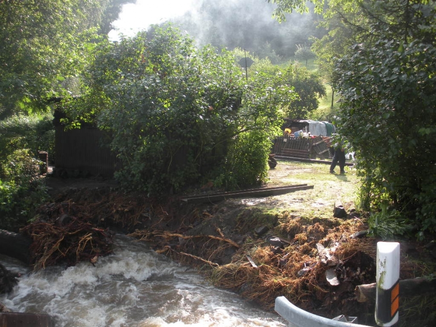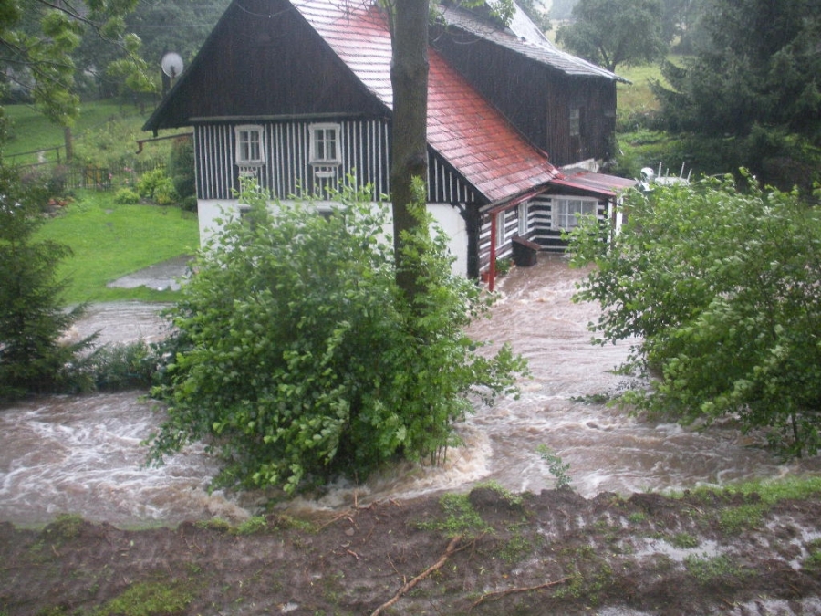 7.8.2010 od rána pršelo. Půda byla nasycená vodou po předchozích deštích. Kolem 10. hodiny ráno jsem šla na procházku s pejsky a viděla jsem, že v potoce velmi rychle přibývá vody a hladina stoupá. Pod obecním úřadem stojí u potoka kůlna, u ní na břehu stál sud a dřevěné palety opřené o kůlnu. Voda se k nim rychle blížila. Bála jsem se, že tyto předměty mohou někde ucpat most a může pak dojít k rozlití vody do domů. Bohužel jsem nesehnala kontakt na majitele těch věcí. Už by je stejně nestihl odstranit, voda je za chvíli odnesla. a bylo hůř. V potoce se v silném proudu začaly valit kameny a společně s hučící vodou vydávaly ohlušující rachot. Proud strhl několik mostků, strhal části břehových zdí i krajnici silnice. V horní části Merboltic byly zaplaveny první domy: Volrábovi a Hlaváčkovi. Níž to byli Drlíkovi, Staňkovi atd. Naštěstí to odnesly jen sklepy a přízemí. U Janurů došlo k sesuvu podmáčeného svahu. Ve spodní části obce u p. Dymáka, který tu má pozemek a chatku za potokem, se o jeho mostek zarazilo všechno, co voda vzala výš po proudu. Dymákovi a jejich sousedé Paškovi byli uvězněni za potokem, nedalo se s nimi kvůli rachotu kamenů a vody ani domluvit, jestli se jim něco nestalo. Naši hasiči a další dobrovolníci se pokoušeli lanem uvolnit předměty zachycené o most, protože už proud začínal trhat silnici. Vůbec neměli šanci s tím pohnout. Můj manžel dojel pro bagr a pokusil se most vyčistit, ale voda ho málem s bagem převrátila. Musela jsem volat záchranný hasičský sbor a požádat je, jestli by nám nemohli poslat UDeeSku. Ta přijela až z Ústí n.L a až za tmy po 22. hodině. Po tmě bylo vše ještě nebezpečnější, kdyby někoho strhl proud, neměl šanci se zachránit. Naši hasiči pomáhali vyčerpat několik sklepů, rozřezat a odvéz popadané stromy, které spadly na elektrické vedení a ve spodní části vesnice nešel proud. Byli jsme všichni promočení na kůži, převlékat se už nemělo smysl. Naštěstí týden před povodní byly ukončeny opravy třinácti historických klenutých mostů, a ty povodeň bez úhony přečkaly. Hodně byl poškozen obecní most u p. Váňové.