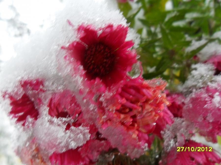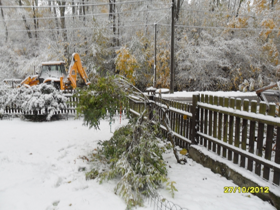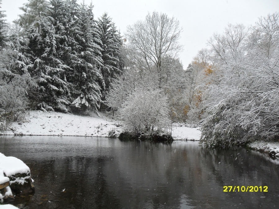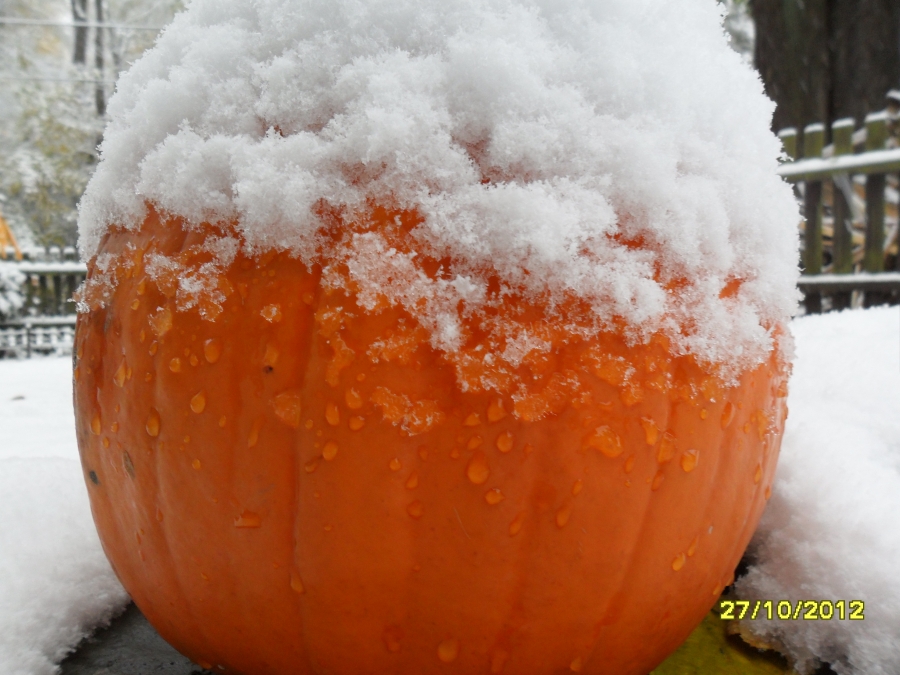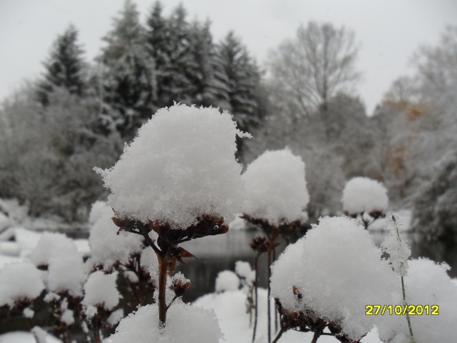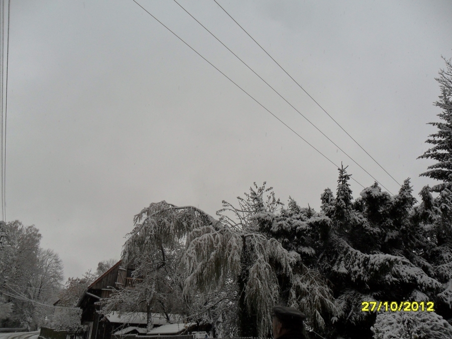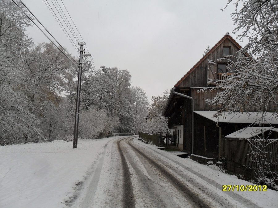 První sněhové vločky spadly 26.10. večer - ještě společně s deštěm. V sobotu 27.10. ráno jsme vstávali a venku to bylo jako o vánocích. Mokrý, těžký a zmrzlý sníh ohýbá větve stromů, na kterých jsou ještě listy. Celý den sněží. Dnes se měla konat drakiáda, kvůli počasí byla odložena na 10.11. Sníh se drží i na silnici. Viz foto níže.