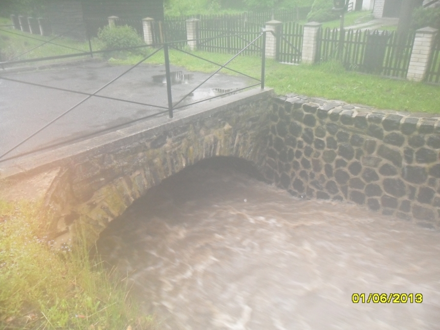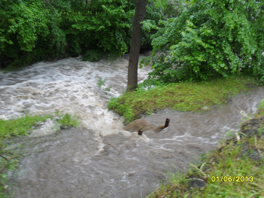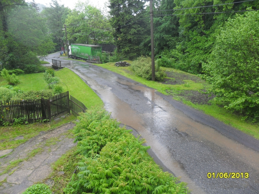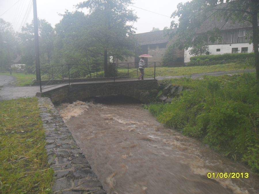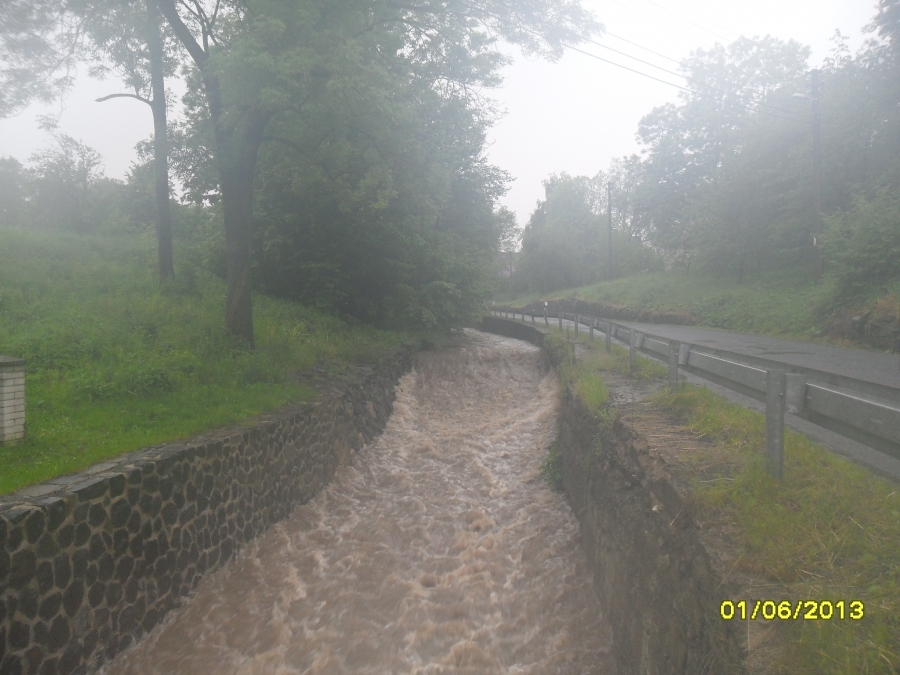 Už několik dní prší, 1.6.13 leje celý den a noc, potok v Merbolticích stoupl a na jezech jsou slyšet valící se kameny, na některých místech v obci (u Kučírků a Hlaváčků) schází k vylití asi 5 cm. Na jezu u Kučírků vzala voda silný trám, který umožňoval nátok vody do náhonu na bývalé koupaliště. Hladiny potoků a řek začínají stoupat na některých místech ČR.