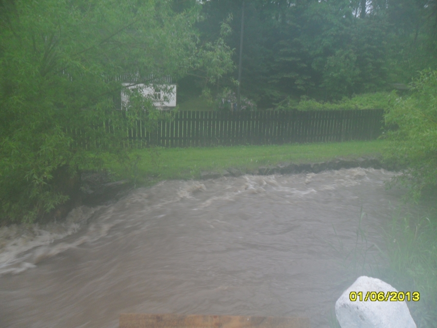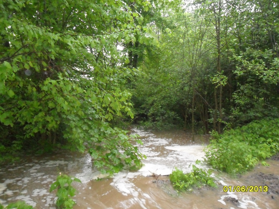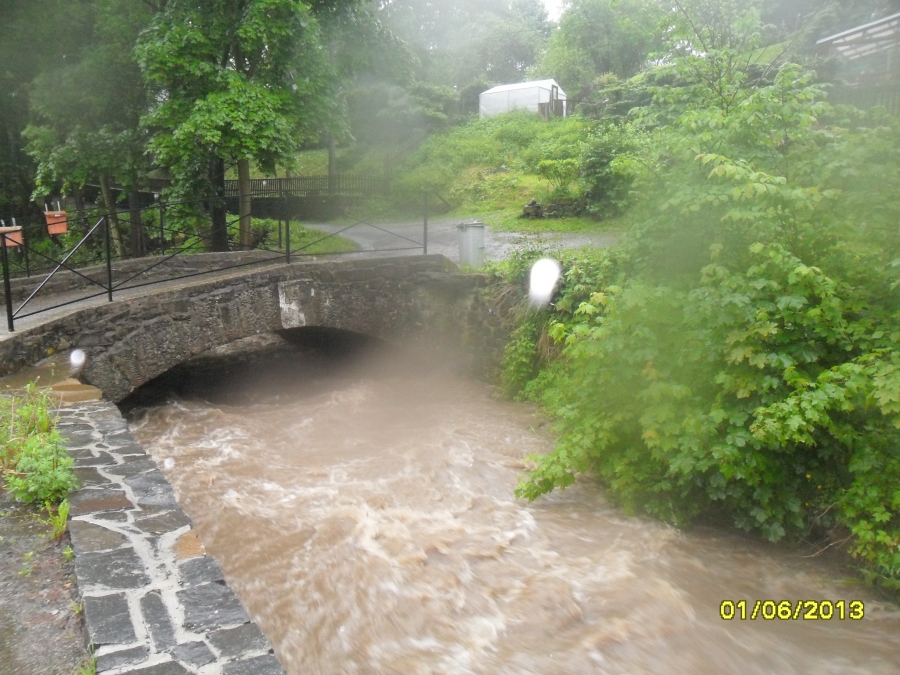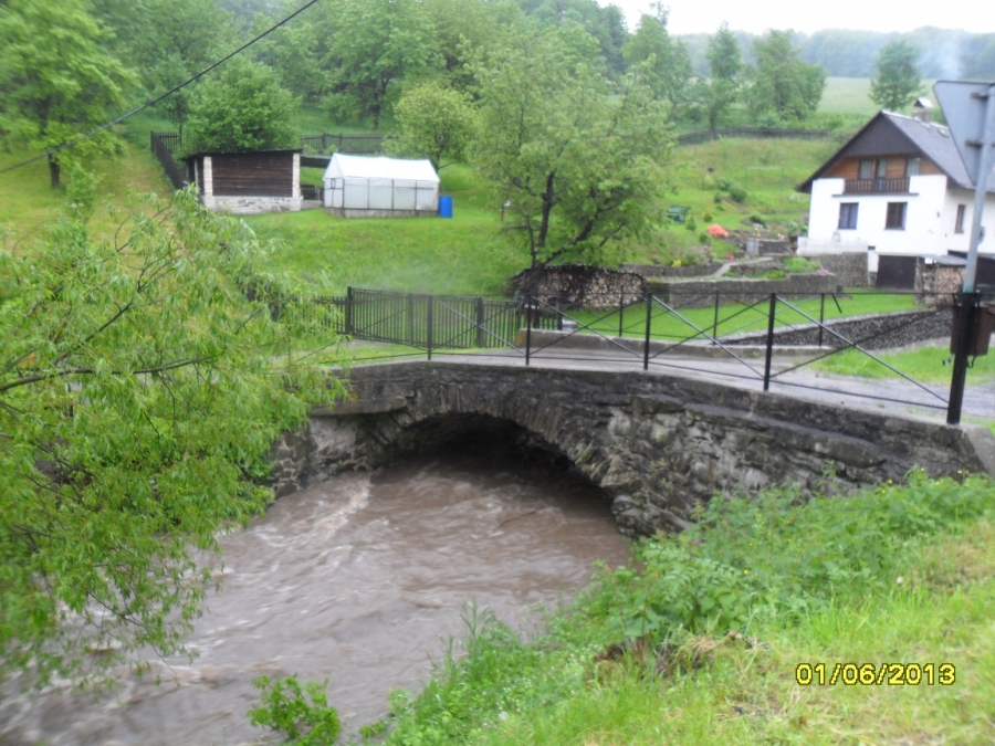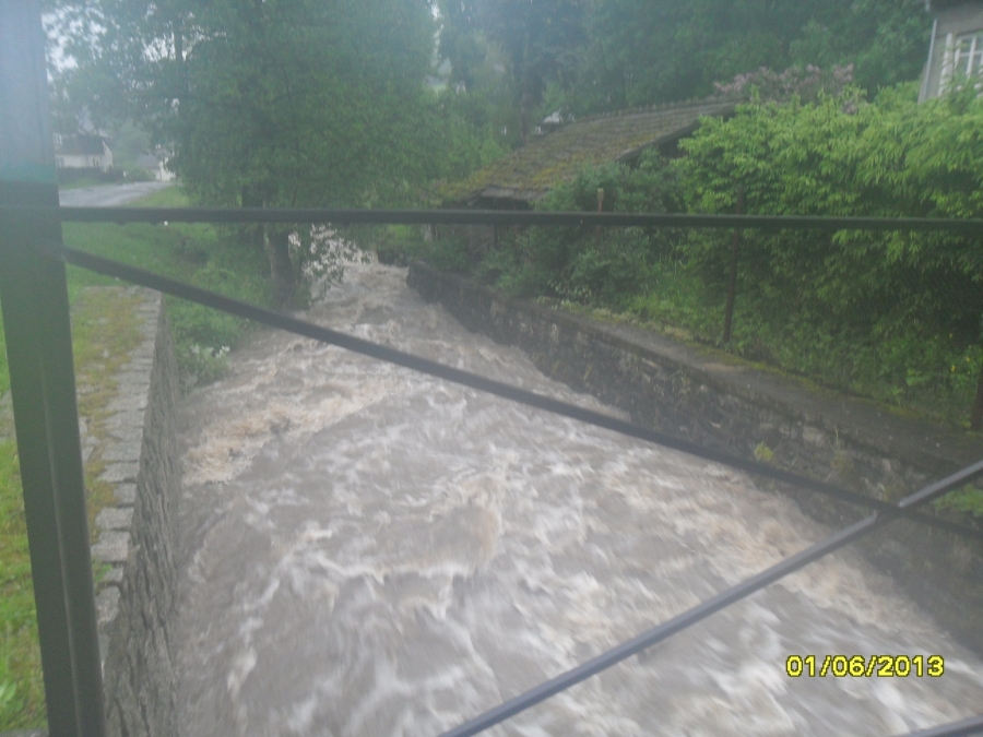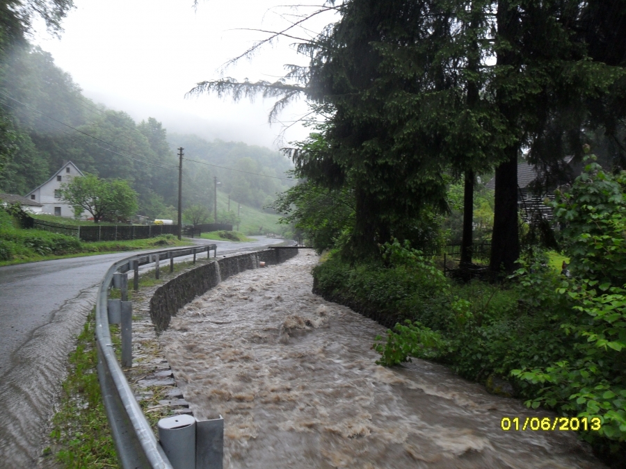 Už několik dní prší, 1.6.13 leje celý den a noc, potok v Merbolticích stoupl a na jezech jsou slyšet valící se kameny, na některých místech v obci (u Kučírků a Hlaváčků) schází k vylití asi 5 cm. Na jezu u Kučírků vzala voda silný trám, který umožňoval nátok vody do náhonu na bývalé koupaliště. Hladiny potoků a řek začínají stoupat na některých místech ČR.