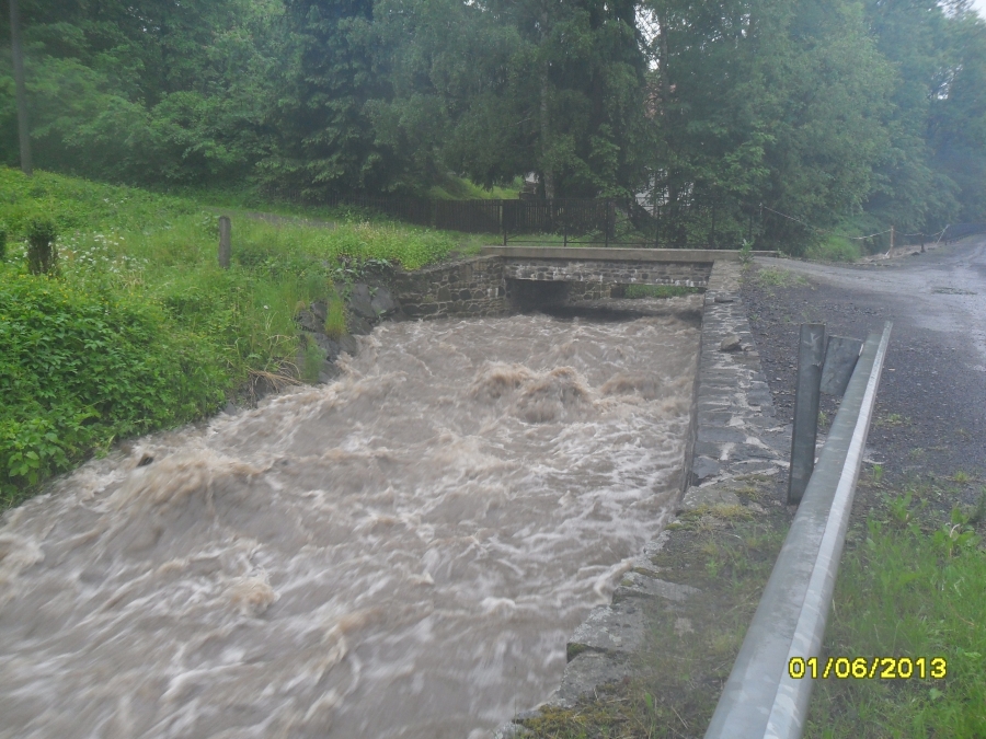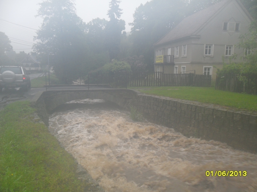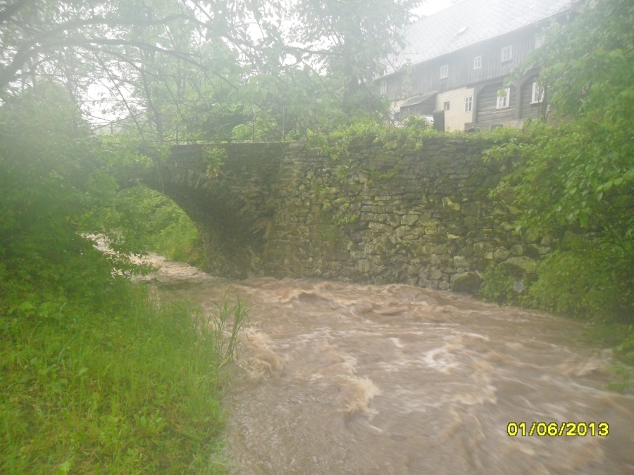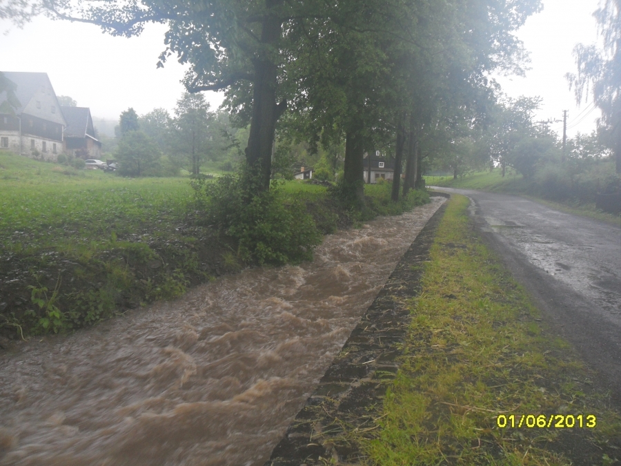 12.6.2013, dnes, ve středu, máme nádherné počasí, Merboltický potok je úplně v klidu, jeho zvýšenou hladinu z předchozích dní připomíná jen polehlá tráva od silného proudu. Labe v Děčíně a v Ústí n.L. je na 3. stupmi, v Praze už rozebírají protipovodńové bariéry. Vláda uvolnila už několik miliard Kč na opravu silnic. Snad už bude od vody pokoj.